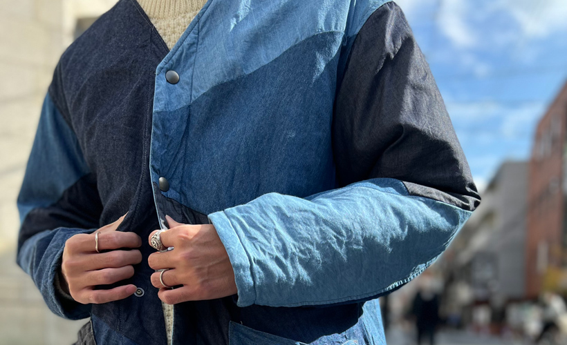 ジャケット×コートも可能なサイズ感で、キルティングとコーデュロイの組み合わせが秋冬らしい。インディゴカラーの裏地は全てアソートなので、一期一会の出会いも楽しみたい。