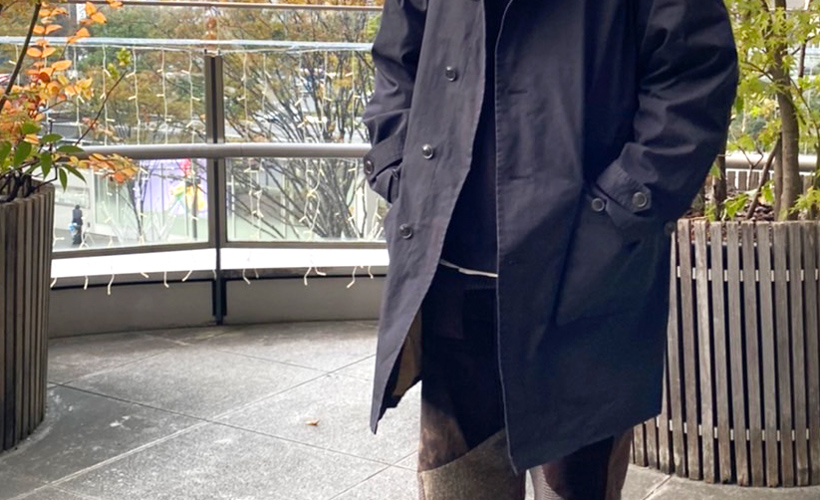 冬スタイリングのメインとなるコートから覗くパッチワークデザインは全く引けを取らない名脇役。キレイめになり過ぎないようスウェットでラフに合わせるのがちょうどいい。