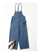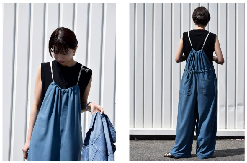 華奢な肩ひもと、少し小さめの前立てのデザインが女性らしい、リラックス感のあるライトオンスデニムのサロペット。腰回りにゆとりのあるシルエットなので着心地もよく、身体のラインを拾わない、薄着の夏にも安心感のあるデザイン。