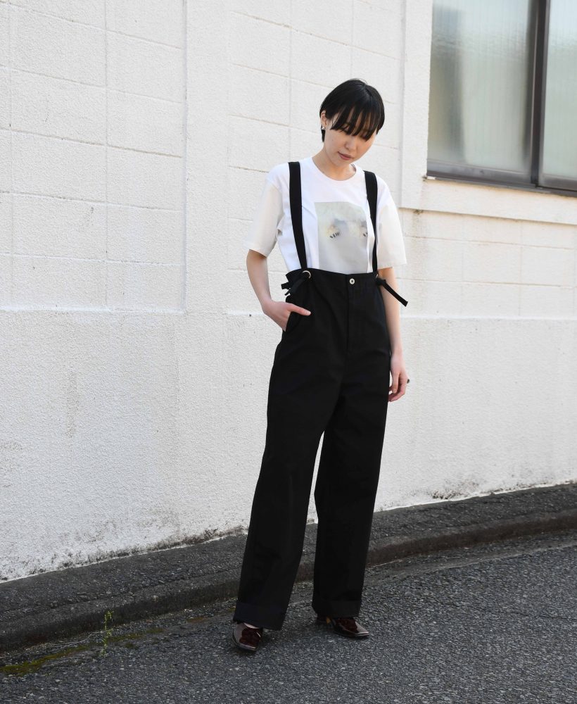 ワイド感が強い太めのシルエットなのでハイウエストでバランスをとった着こなしがおすすめです。その際サスペンダーの紐は自分で好きな長さに結びなおすことで調整ができるので楽に好みの長さに変更していただけますよ。また、ウエスト部分のアジャスタも軽いコットン素材なのでキュッとしっかり留まってウエスト周りはコンパクトにまとめることができます。