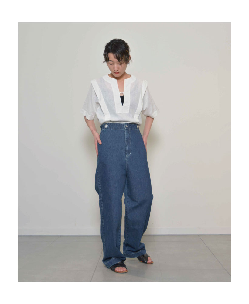 太すぎず細すぎないすっきりとしたストレートシルエットなので、シンプルにジャストウエストで着ていただいても様になります。ウエストの内側にコードがついているので、その日の気分で腰に落として穿いてメンズライクな着こなしも楽しめそうです。
