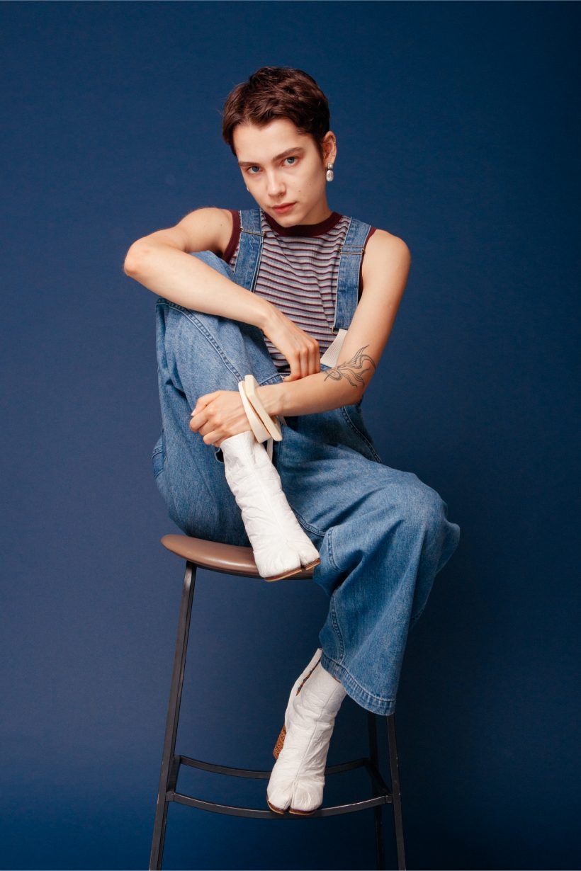 アメリカ海軍のデッキパンツをベースにアレンジを加えたサロペットと、シンプルな無地のTシャツを合せたスタイリング。 オールホワイトコーデには、存在感のあるヴィンテージっぽい色小物を合わせて。