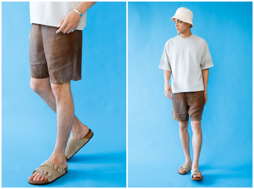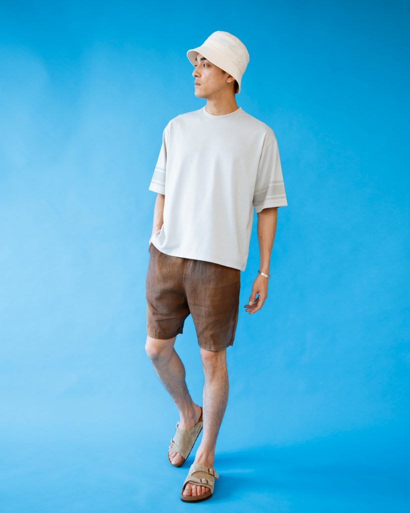 職人が手作業で刷毛を使って染色を施している【rebear by Johnbull】のリネンイージーショーツ。リネンの優しい素材感は早朝の穏やかでゆっくりと流れる散歩の時間にピッタリで、リラックスしているけど大人の品は感じられます。トップスもリラックスシルエットのモノをチョイスし、さり気ない袖のポイントがアクセントに。早朝と言えど夏場の日差しは強いのバケットハットなどは必須アイテム。