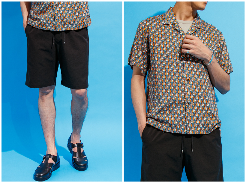 ジリジリと夏の日差しを感じるお昼時はサラリと清涼感のあるスタイリングに。大人気の機能素材【COOL DOTS®】のショーツは無数の細かい気孔があり圧倒的な軽さと清涼感が魅力です。落ち着いた雰囲気の柄シャツをシンプルに合わせると、スタイリングにメリハリが出ておすすめ。