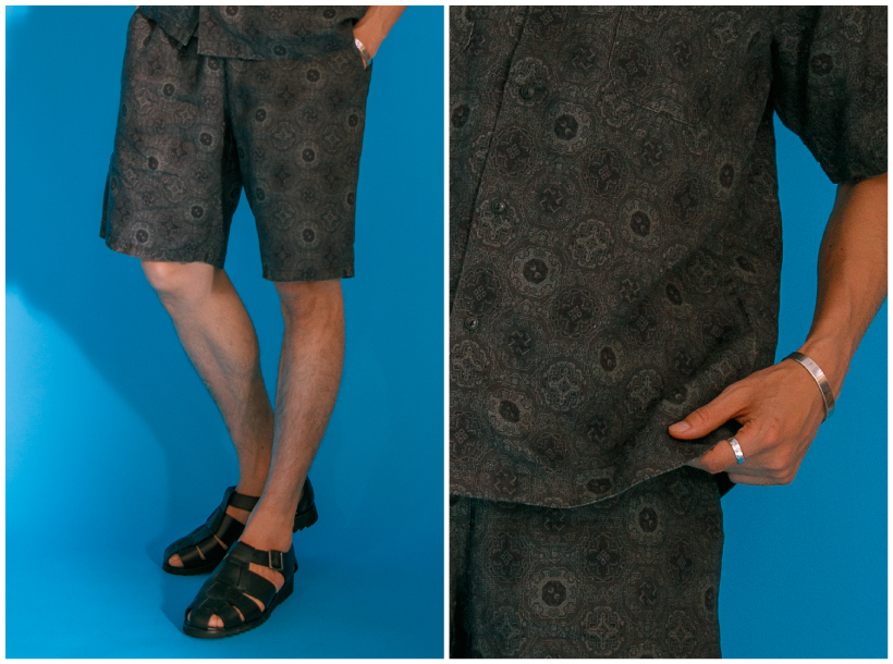 リネン素材にプリントを施したショートスリーブシャツとショーツのセットアップ。ルードな雰囲気を感じる柄モノのセットアップで、どこかラグジュアリーな要素も垣間見えるバランスに。リネン特有の粗野な素材感が、セットアップでもキメすぎていないナチュラルなスタイリングを楽しませてくれます。