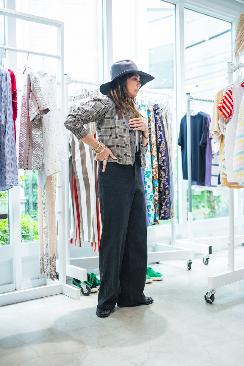 今回はオーナーの山本めぐみさんにコラボレーションアイテムのリネンパンツをセルフスタイリングでご着用いただきました。グッドセンスなスタイリングにもぜひご注目ください。