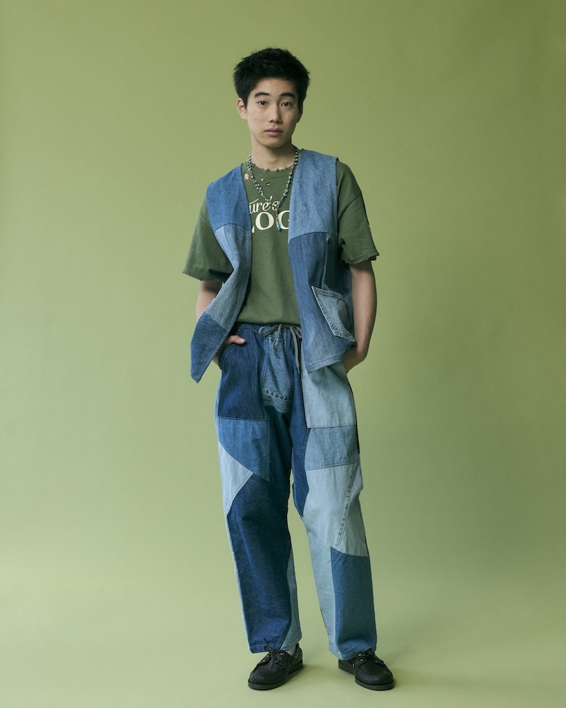 同じrebear by Johnbullのパッチワークデニムベストとイージーパンツを合わせたオリジナリティ溢れるスタイル。どれも同じものが一つとして世界に存在しない唯一無二の着こなしを楽しめます。