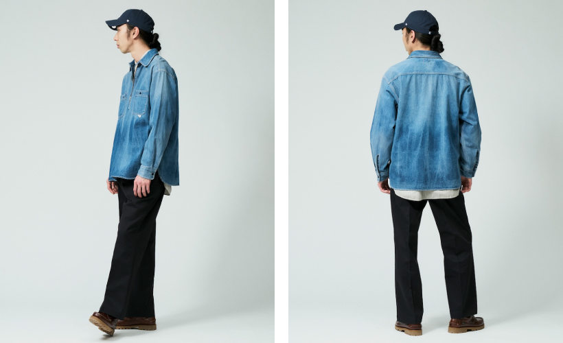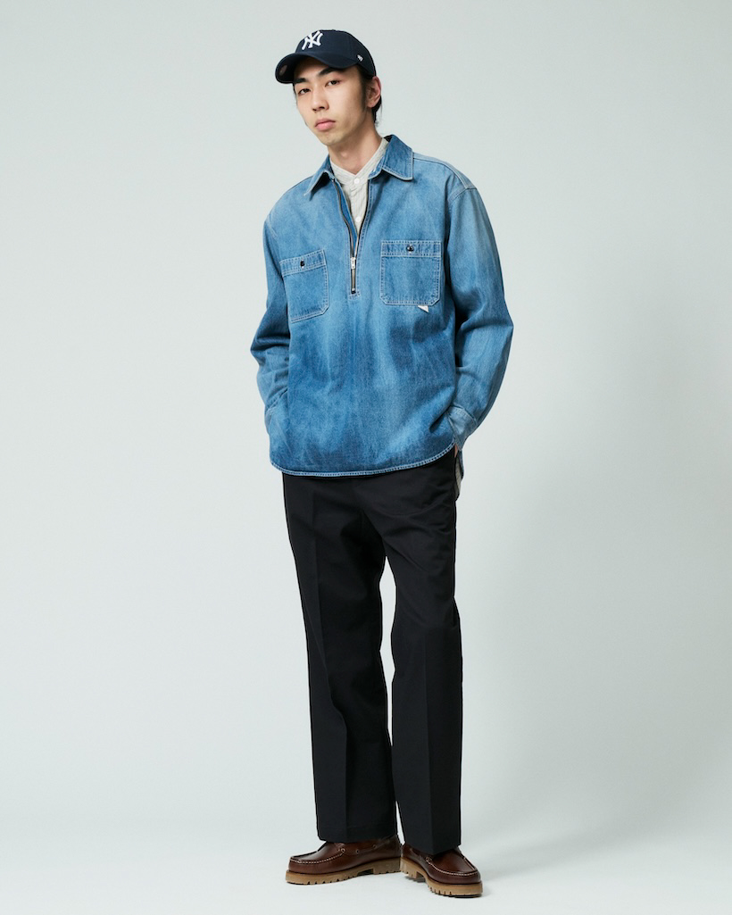 新しいラインナップとなるハーフジップシャツを都会的なイメージで合わせたスタイル。Tシャツ・シャツ・スウェットなどインナーに合わせるアイテムによって主役としても脇役としても使える万能アイテムです。