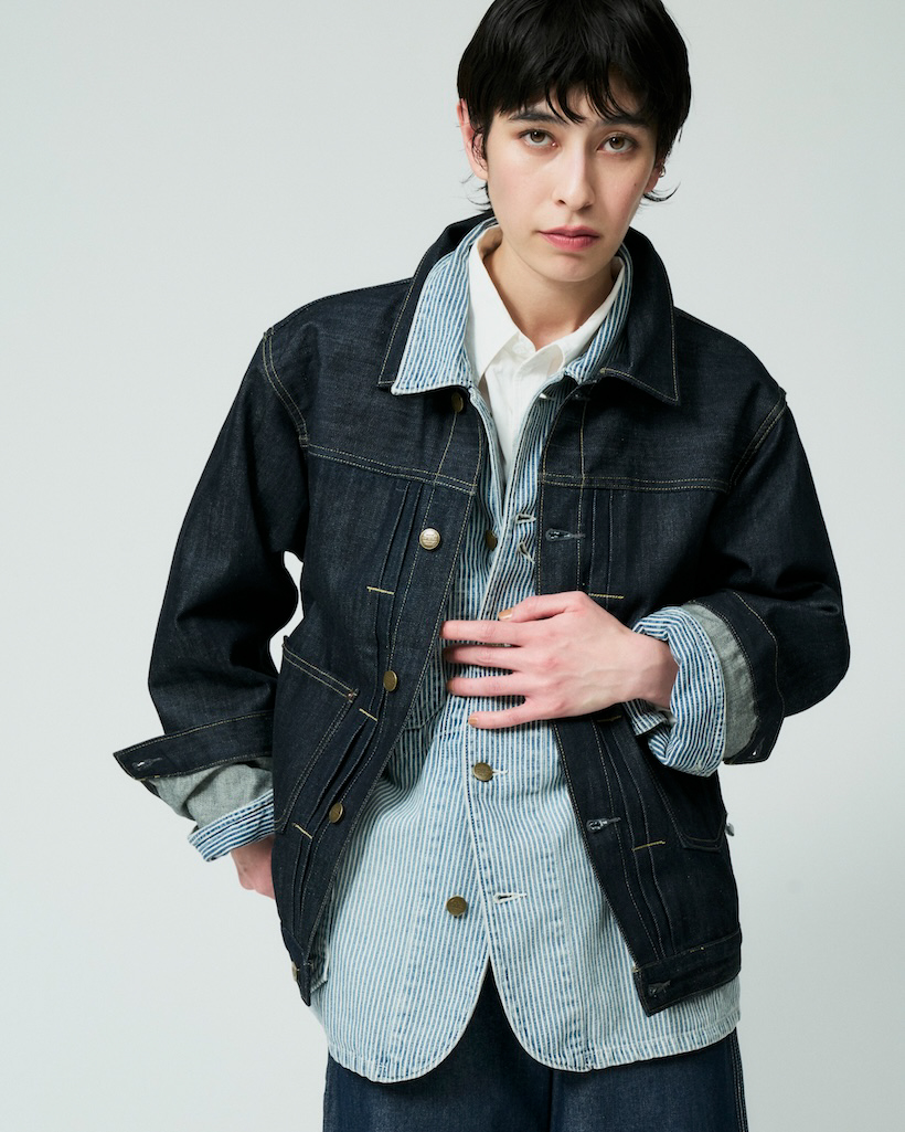 比嘉商店とコラボレーションしたデニムジャケットに、ヒッコリー柄のチョアジャケットをあわせたレイヤードスタイル。白シャツにデニムというシンプルな合わせですが、さりげなく見えるヒッコリー柄がスタイルのアクセントに。