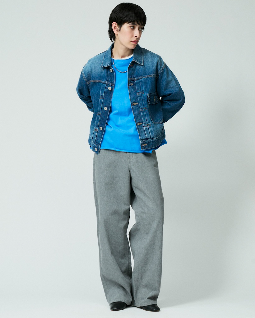 直営店舗限定のグレーデニムのワークパンツをGジャンとシンプルに合わせたスタイリング。程良い太さのワークパンツはヒールで合わせると裾までストンと綺麗なラインが出る美シルエットです。