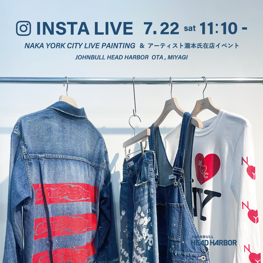 Johnbull Private labo公式インスタグラムのインスタライブにて、NAKA YORK CITY × JOHNBULL collaboration itemとイベントの様子を、デザイナーの瀧本氏(@hoshiguratantaki_araya.aka.nyc)にご参加頂き配信いたします。
