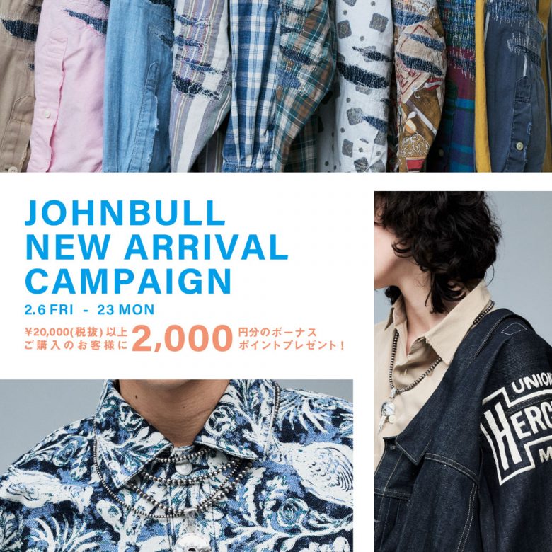 JOHNBULL直営店舗/JOHNBULL ONLINE STOREにて、2/6(金)~2/23(月・祝)の期間中、¥20,000(税抜)以上のお買い物をしていただくと会員ステージに応じた通常のポイント付与に加えて、2,000円分のボーナスポイントをプレゼントいたします。
