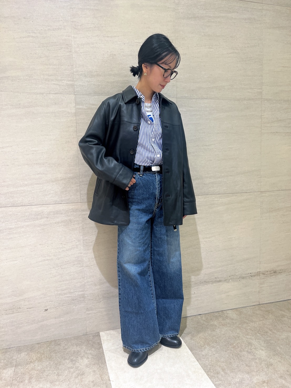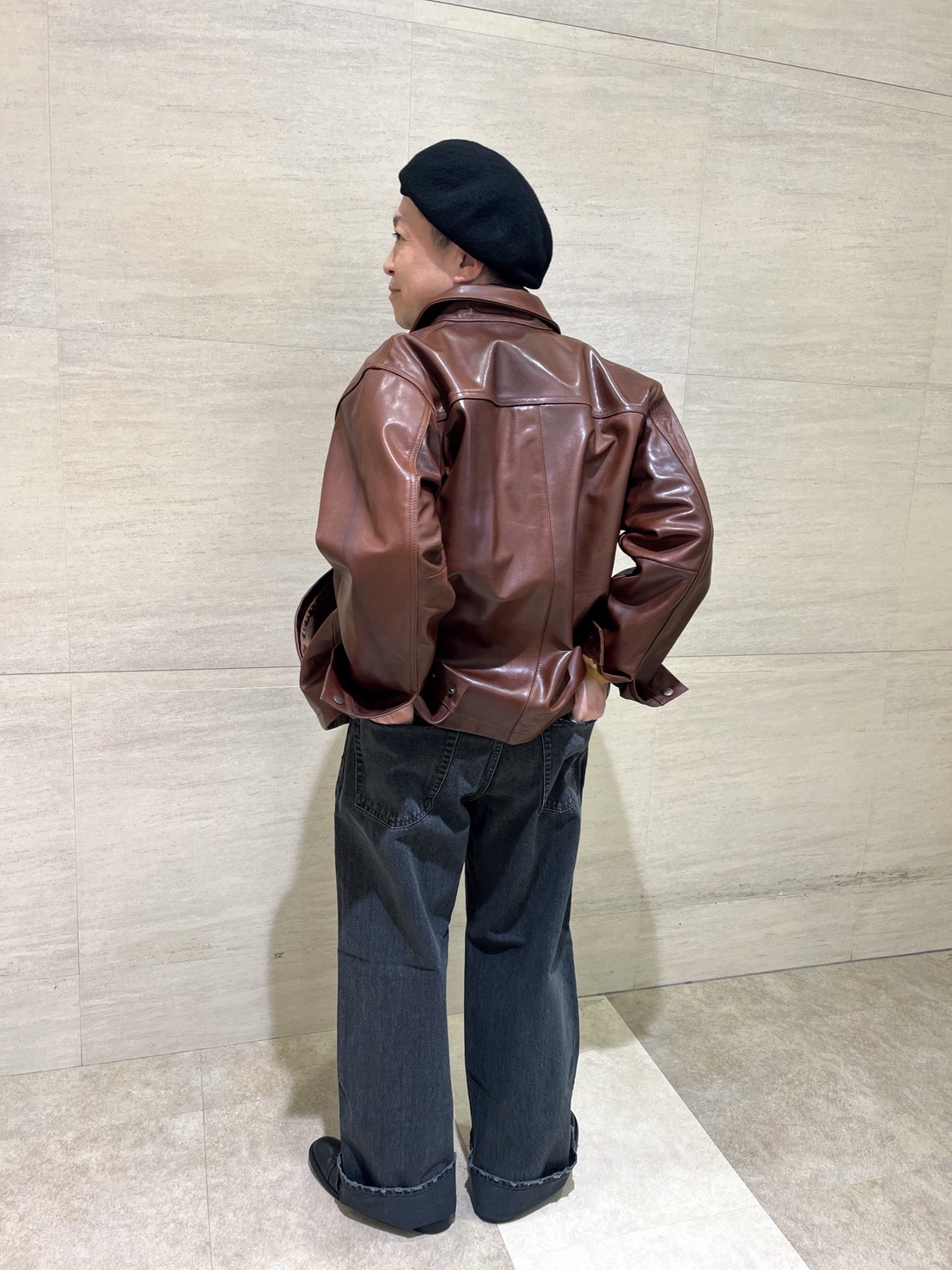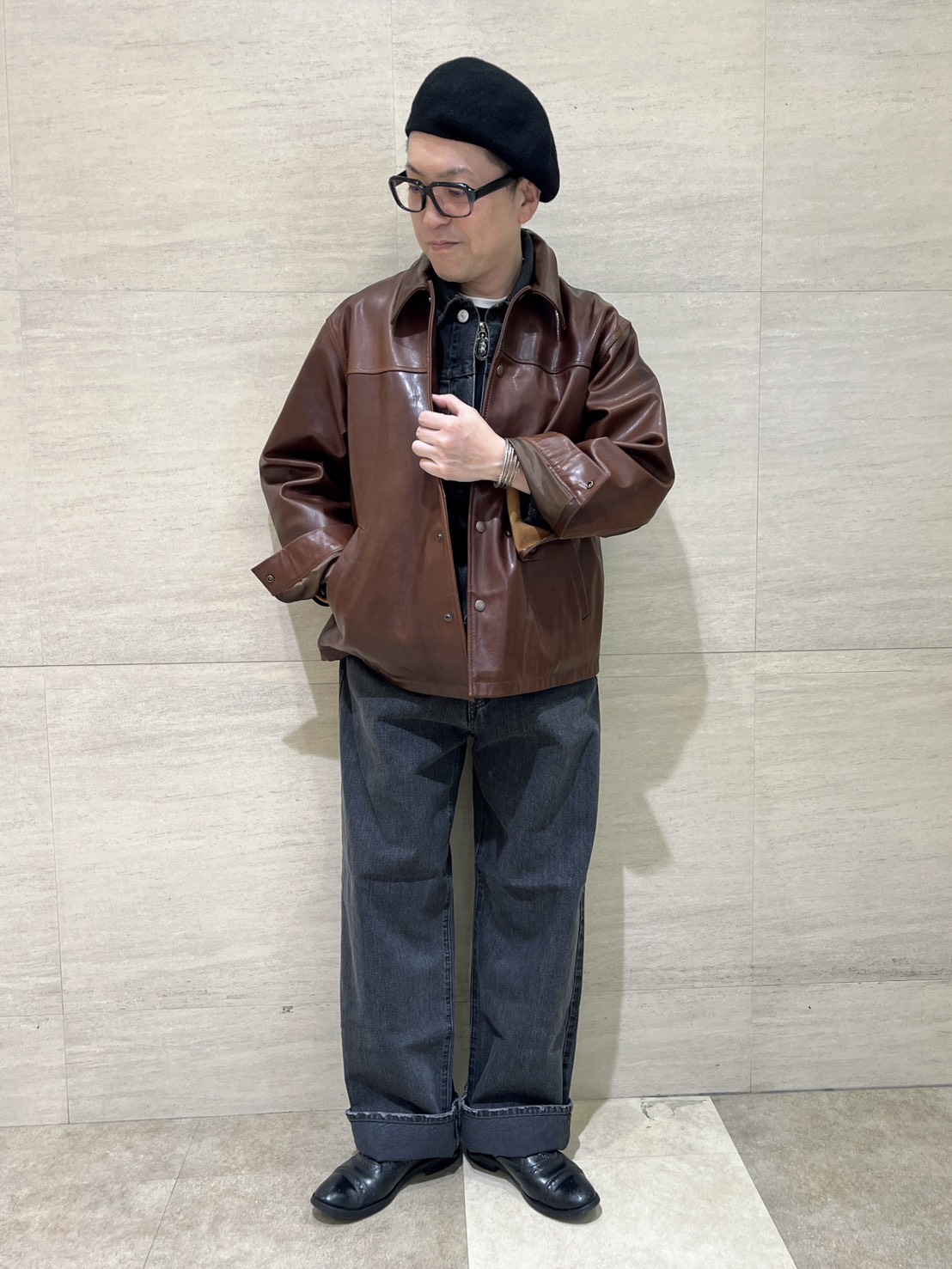 レザージャケット以外をブラックでまとめるとレザーの濃淡がより引き立ちます。