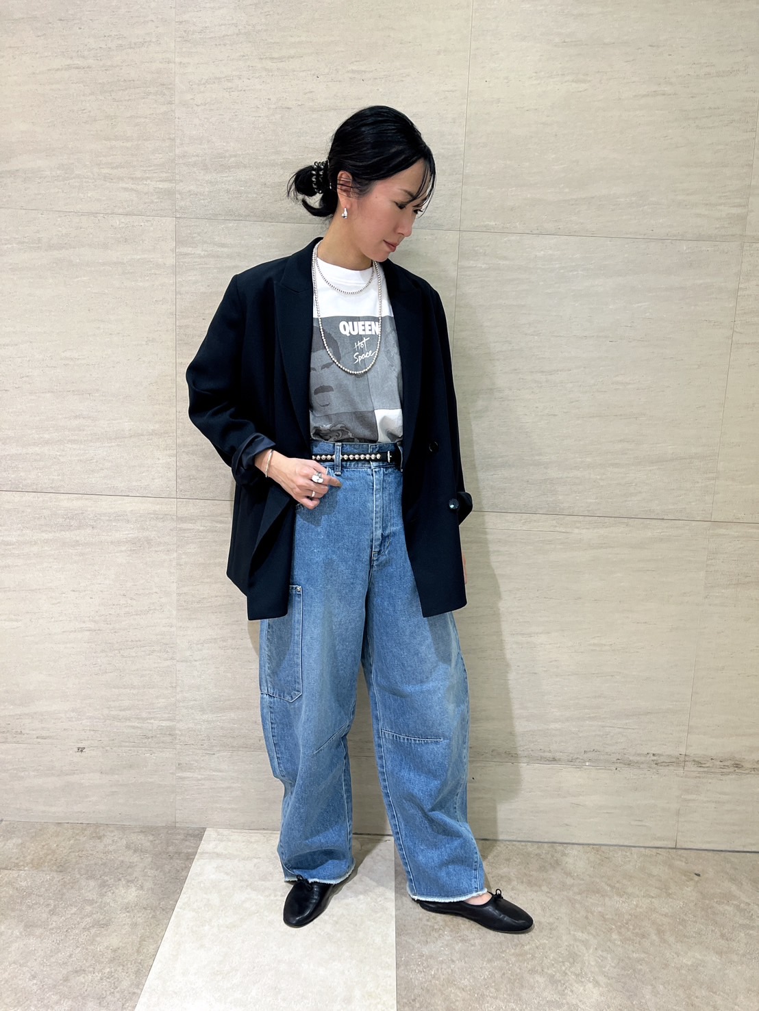 デニムはベーシックなペインターパンツをベースにカーブを効かせてカジュアルに。
