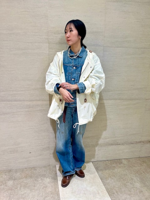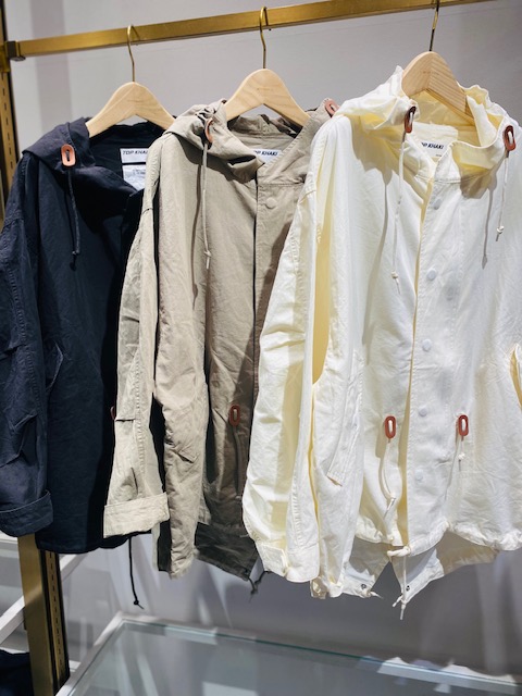 デニムのセットアップの上に羽織ると軽い素材感とリネンのナチュラルな表情で柔らかい印象にバックはモッズコードの象徴でもある裾のフィッシュテールデザインで、紐を調整することでクシュっと感が作れます♪