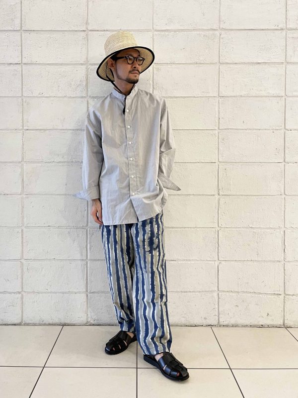 【Attick by Johnbull】のスタンドカラーシャツはコットン、リネンで風合いと色味が抜群です。ブルー系のストライプと合わせて涼し気な印象に。