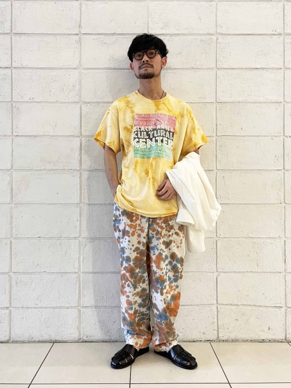 シンプルにTシャツとのコーディネート。古着を加工した【rebear vintage】とは相性◎。無地ティーでシンプルにまとめるよりもこれくらい派手にスタイリングする方が、今の気分です。パンツはMサイズ着用。