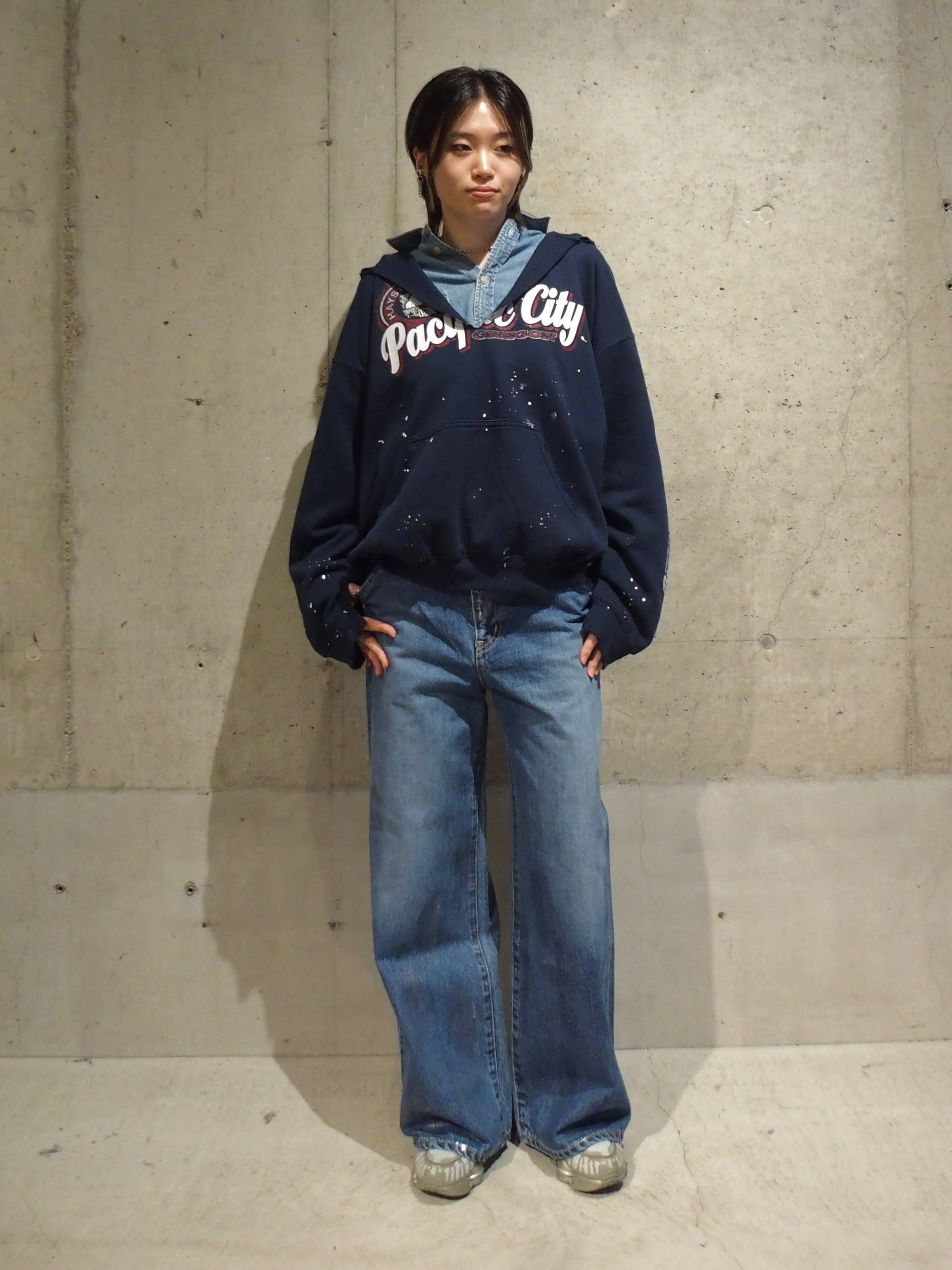 あえてワンサイズ大きいサイズを腰で落として穿くことでラフなスタイルに♪