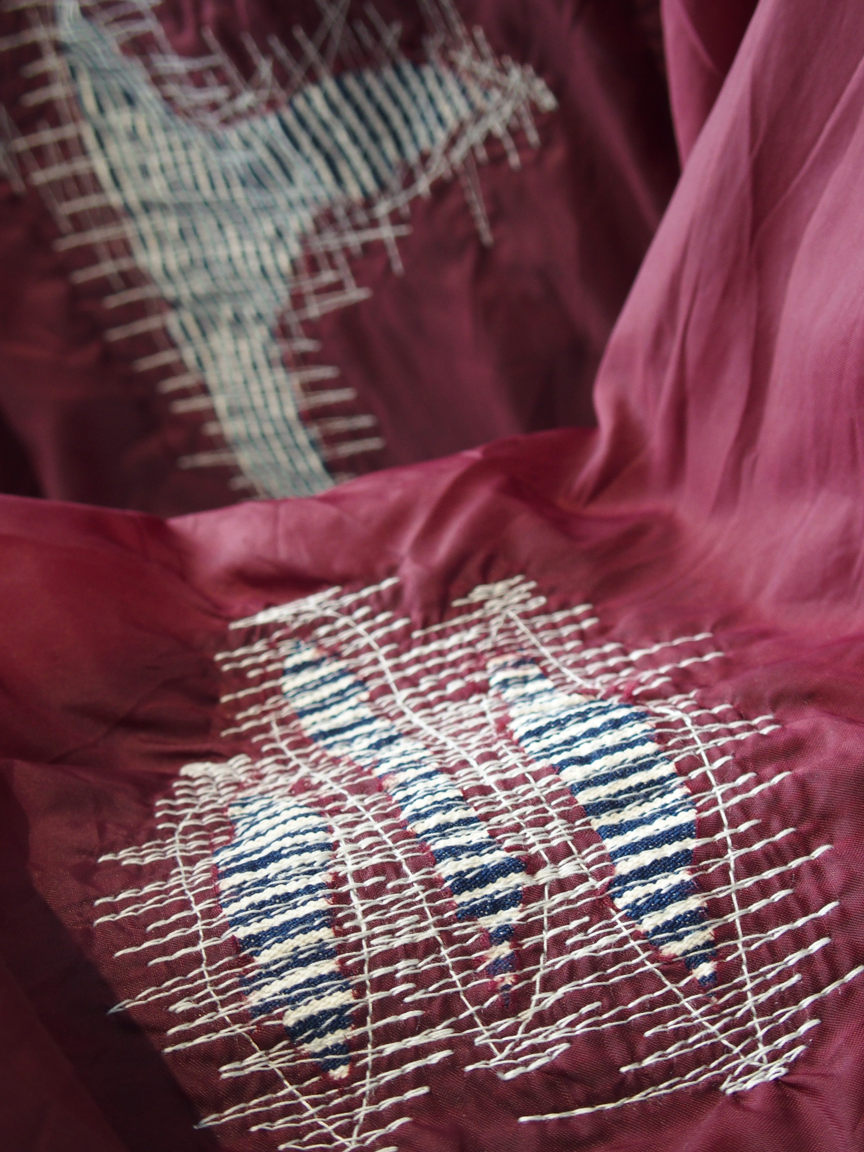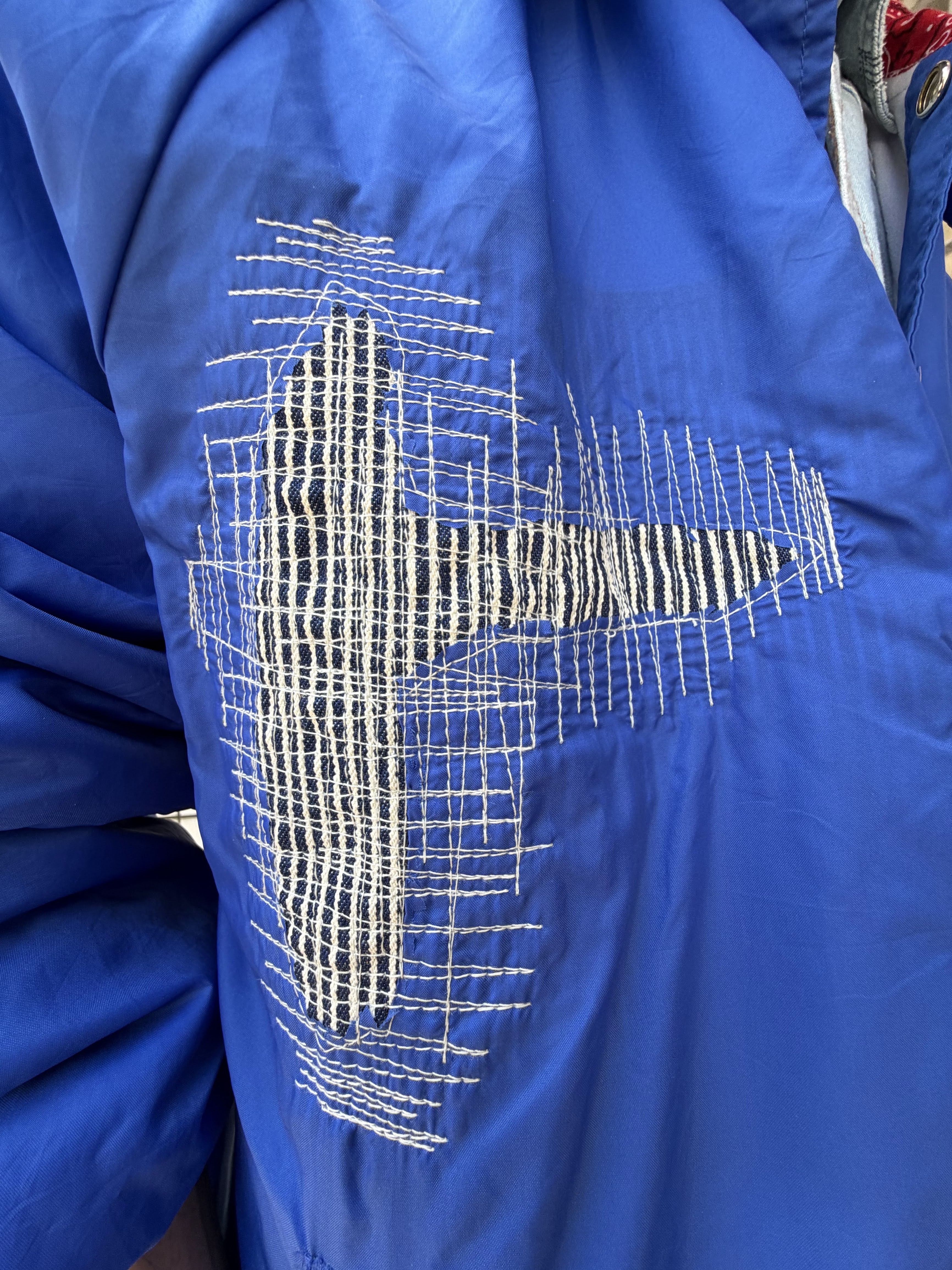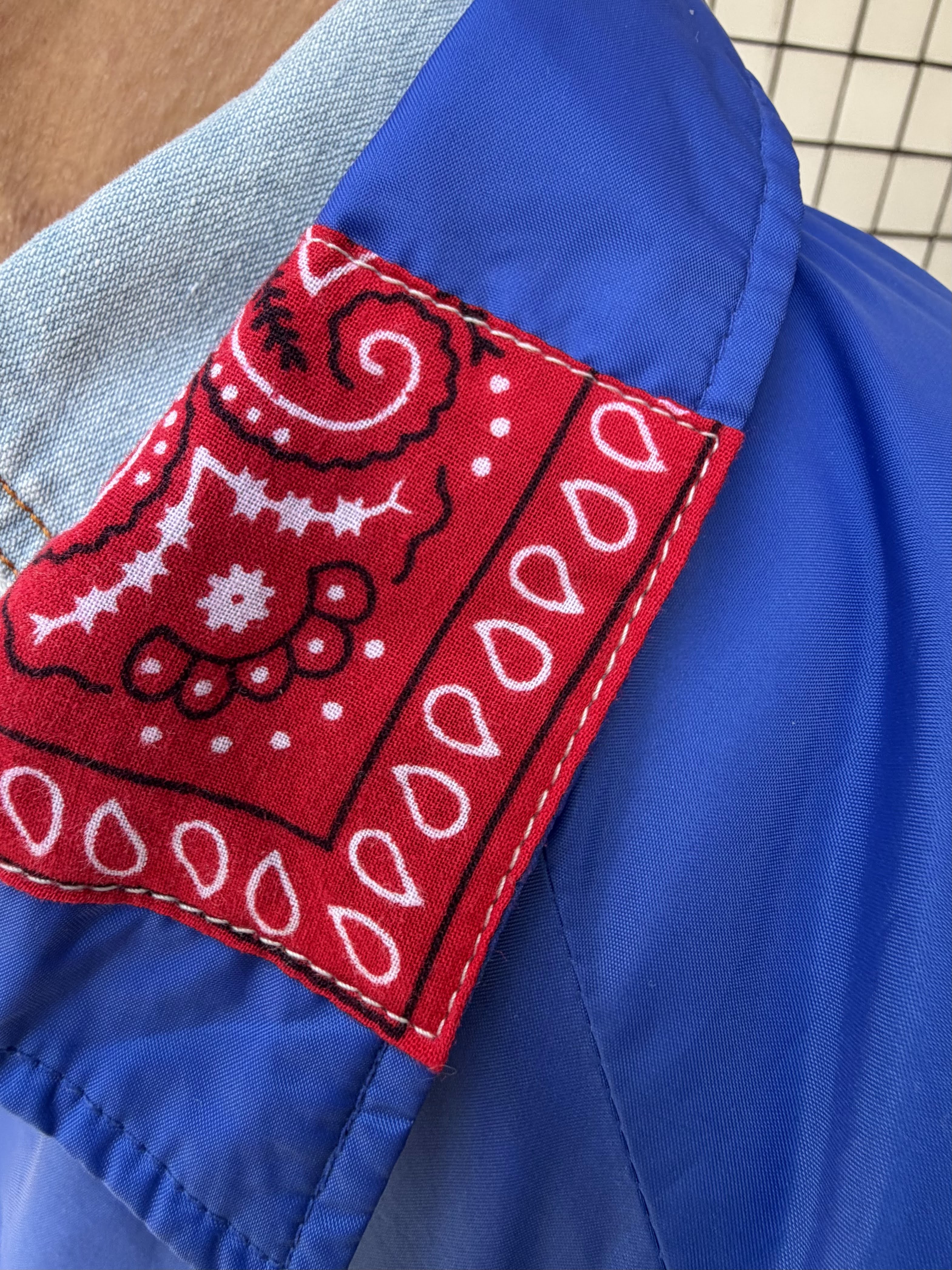 襟元にバンダナの生地が縫われていたり、ヒッコリー柄の生地をパッチワークしていたりと、たくさんのポイントが個性を光らせるアイテムになっています✨