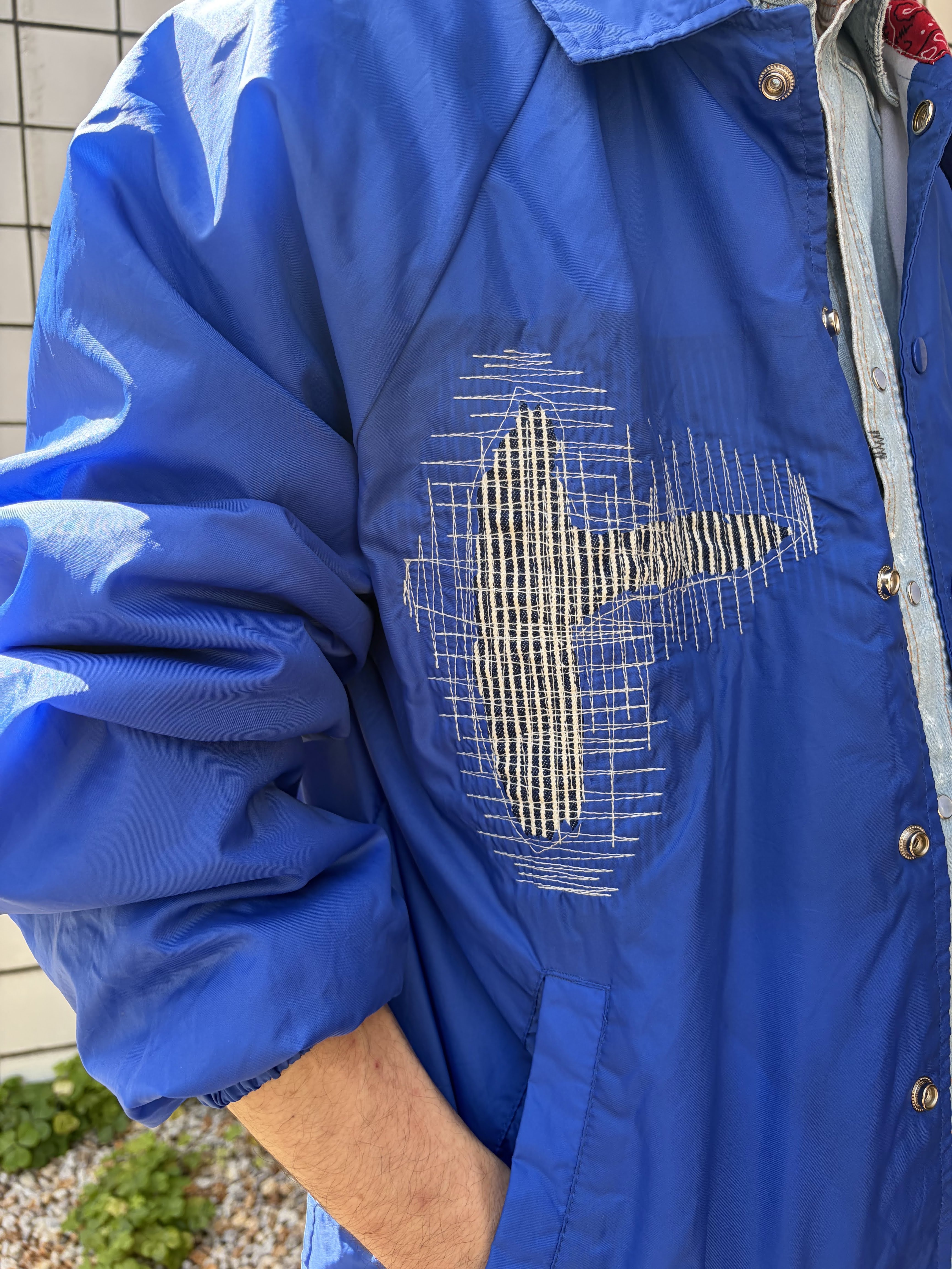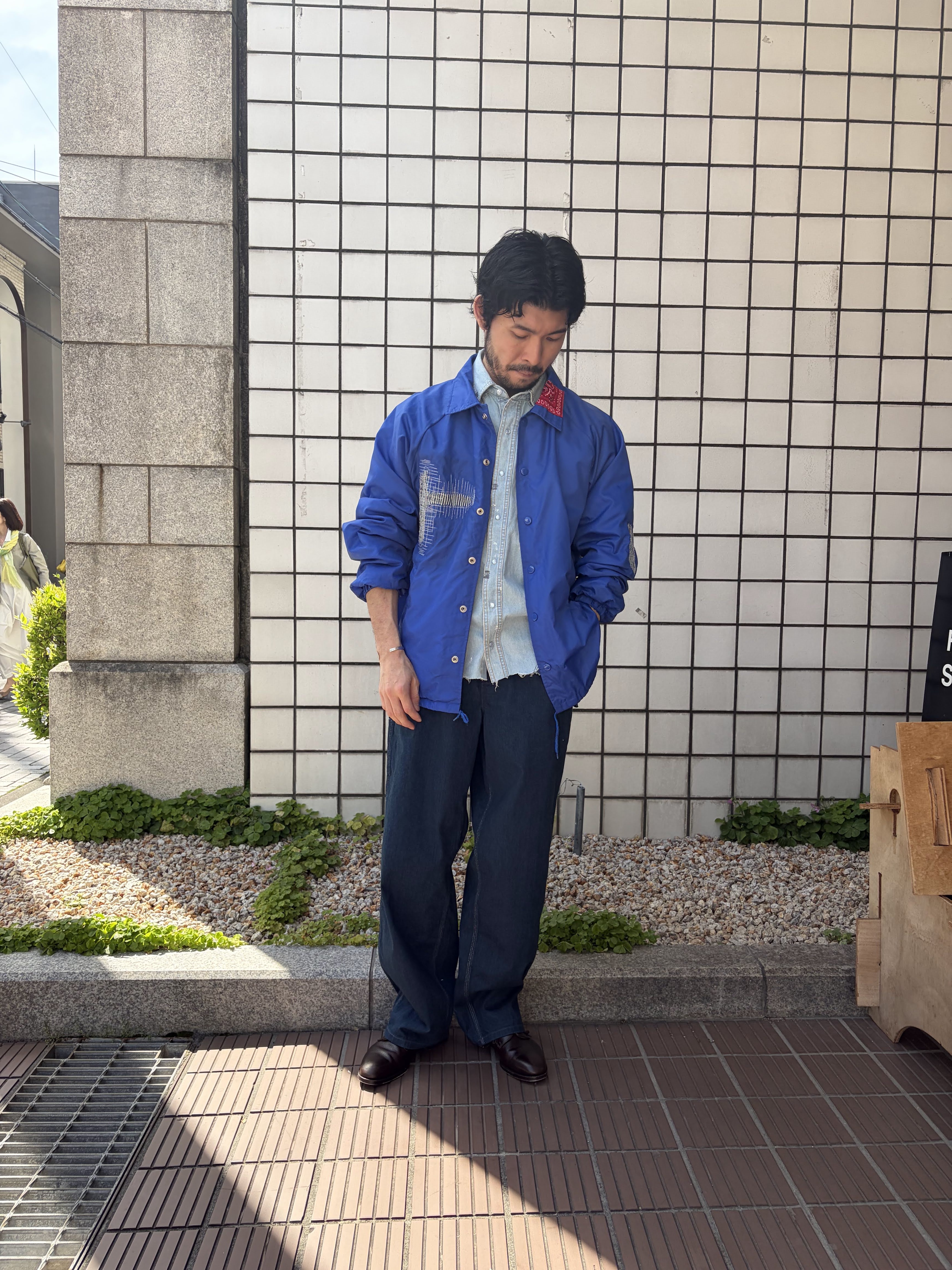 鮮やかなブルーのコーチジャケットをチョイス。インナーに着ているシャツやボトムスの色をブルー系でまとめ、コーチジャケットを主役にしたワントーンコーディネートの完成です!