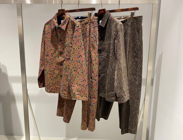 暗いカラーのブラウンは生地の状態で染めたコーデュロイを部分的に色抜きし、その上にプリントを施しています。