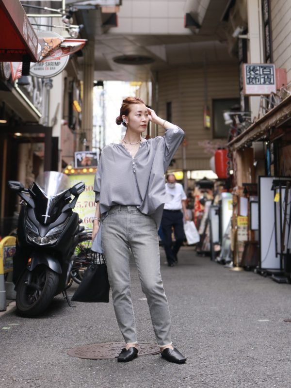 カジュアル感のあるテーパードデニムを落ち感のあるブラウスと合わせることで大人なスタイリングに。