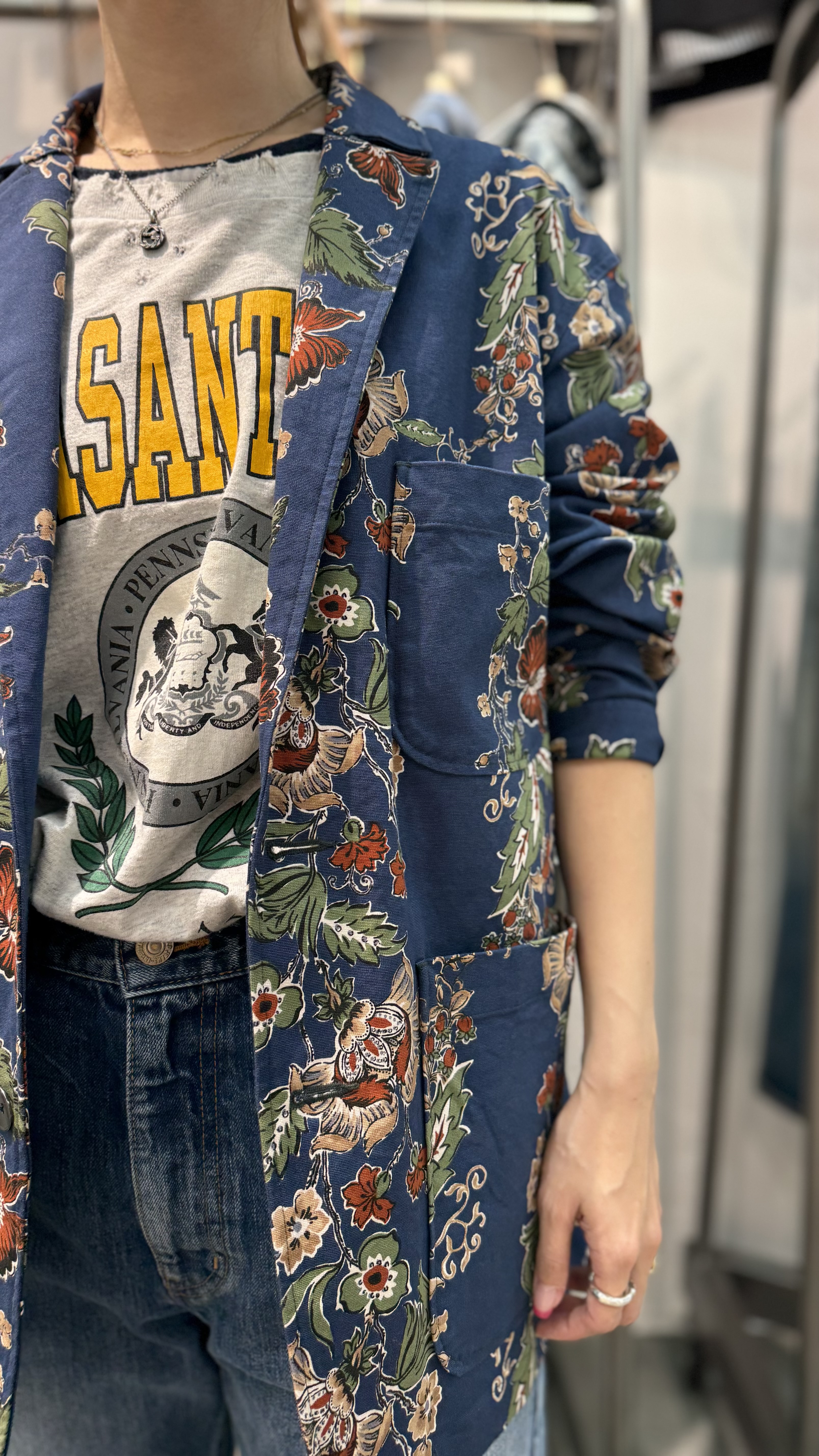 暑い時はジャケットを肩掛けなどでアレンジをしても素敵です。