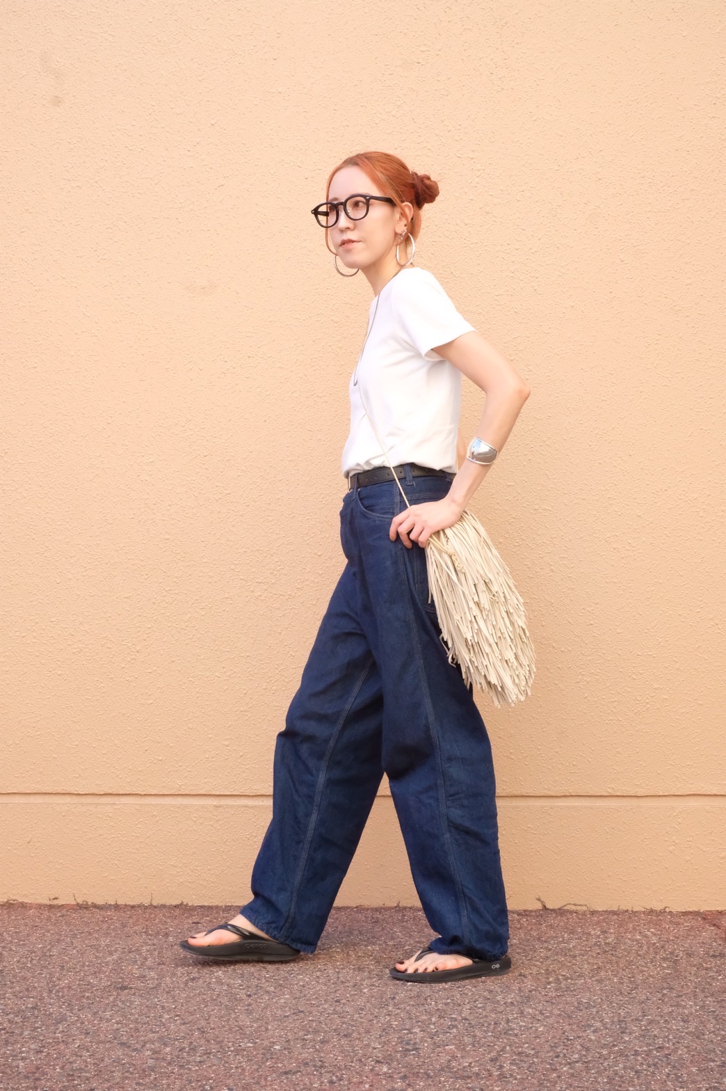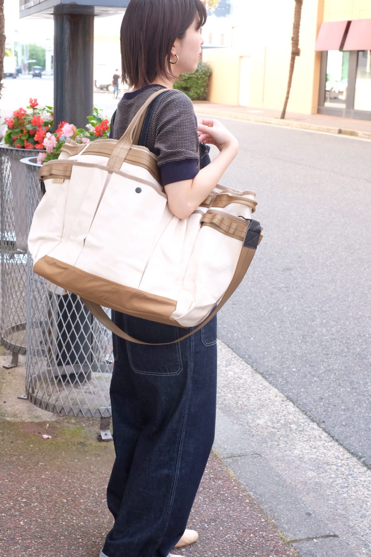 あえてシンプルな白シャツとデニムで思いっきりバッグを引きたてるスタイリングです。