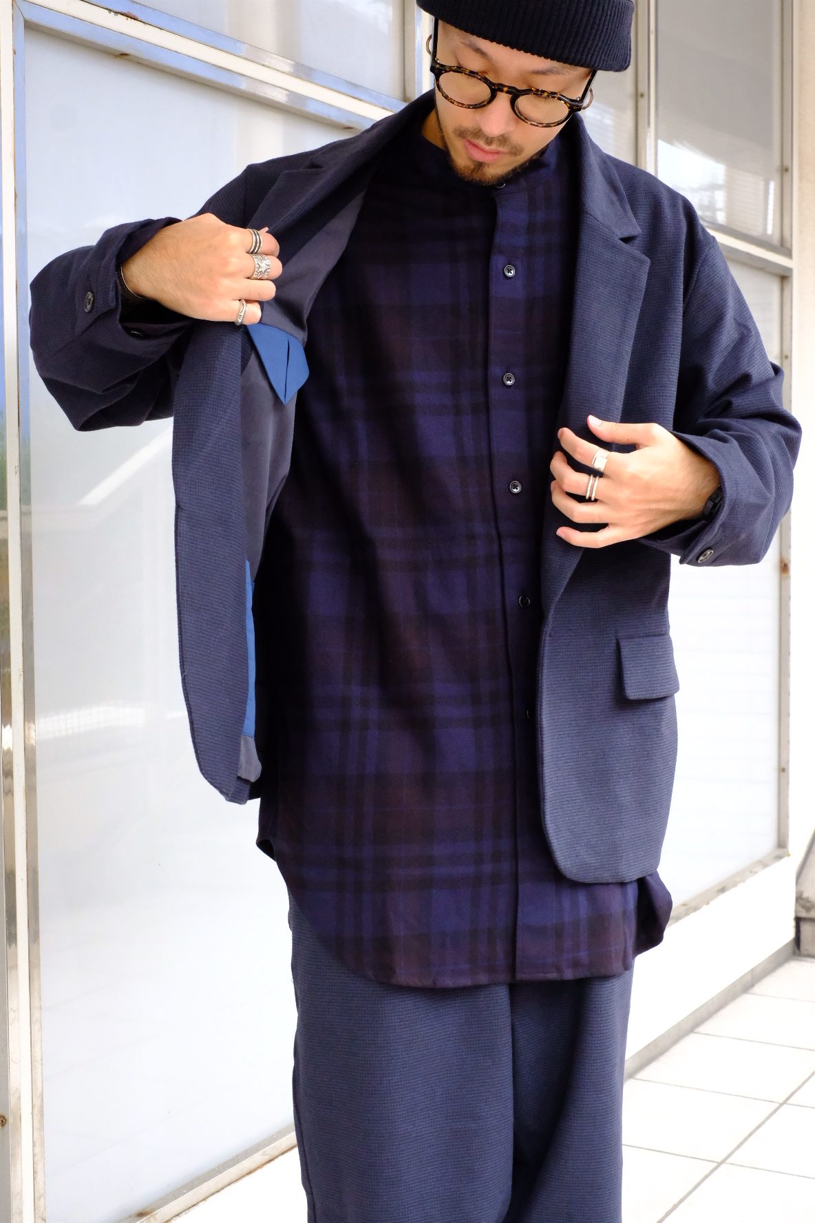 少しオーバーサイズで身幅の広めなボックスシルエットでトレンド感もあり、インナーも薄手から少し厚手のものまで合わせていただけます。