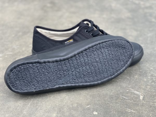 水で滑りやすくなっている場所(船の甲板)でもグリップが効くよう設計されたラバーソールで、水を逃がすようにほんの少しだけヒールを高くしています。海軍ならではのポイントですね!
