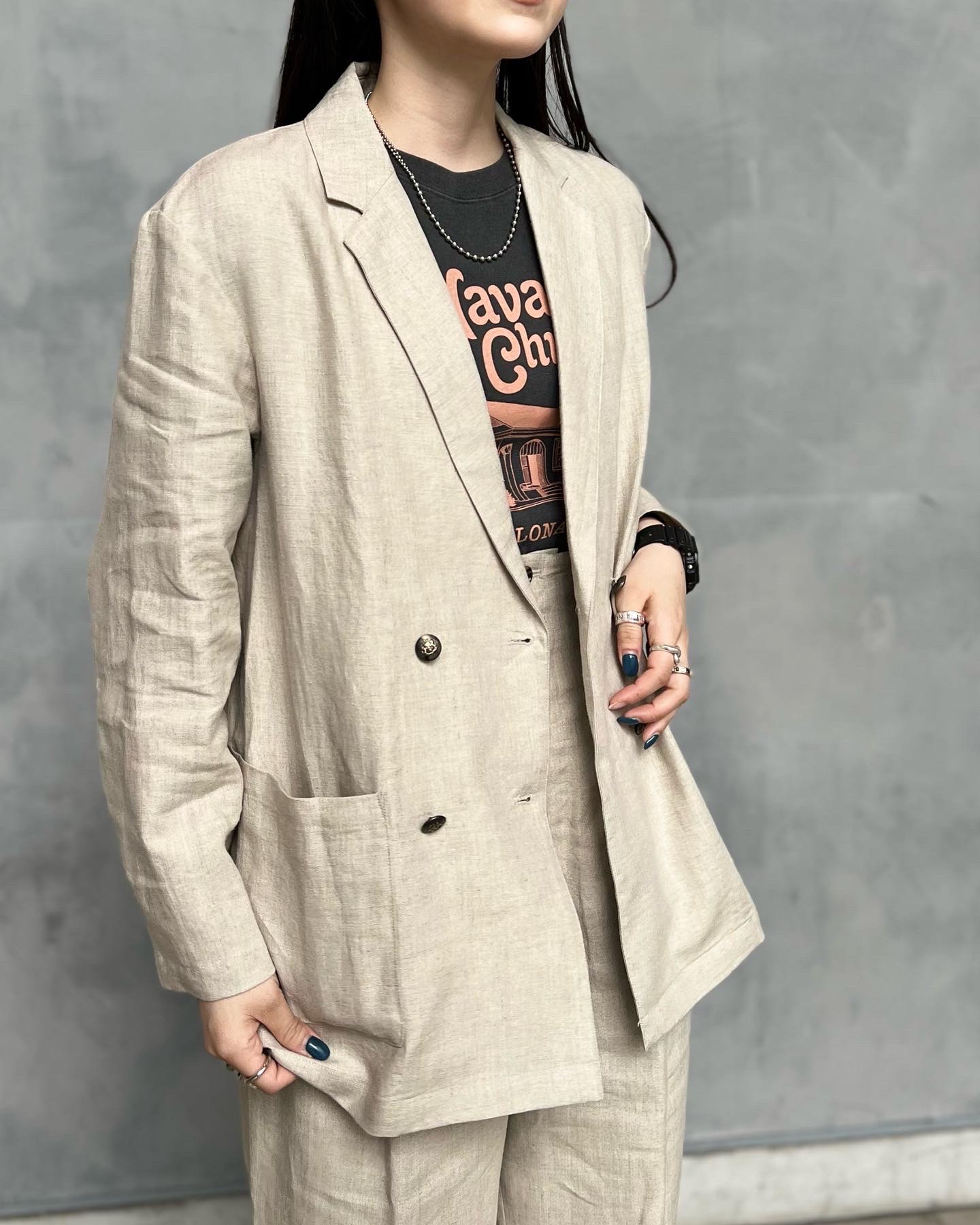 ダブルジャケットのメンズライクさとゆったりとしたワイドパンツがマッチしているこちらのセットアップはヘビロテ間違いなし。