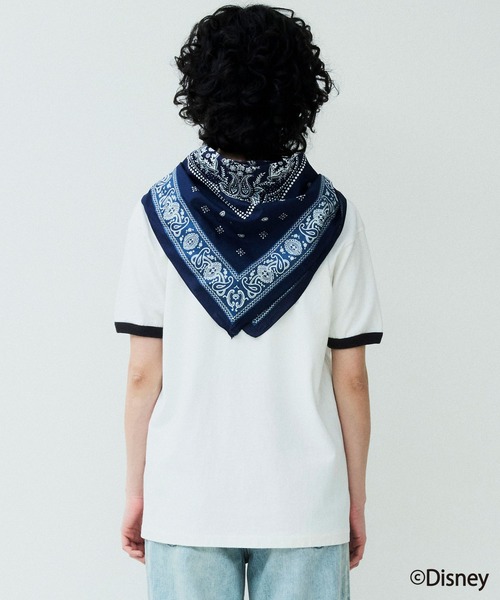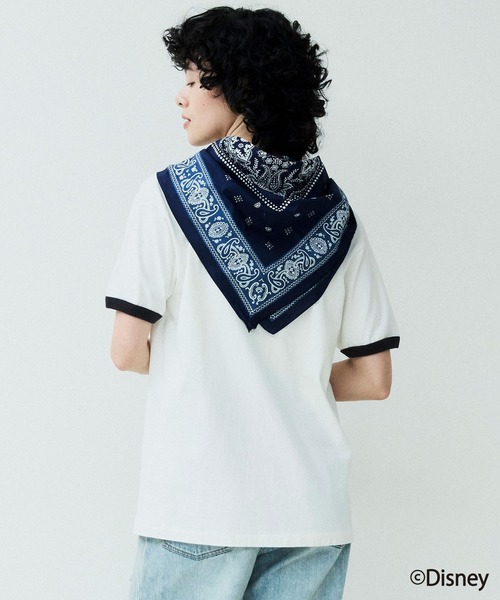 どんな使い方をしてもスタイリングのアクセントになるような華やかなフレーム風の柄を、国内にあるバンダナに特化した工場で職人さんが一枚ずつ手で型染めしています。