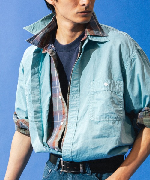通常、チェック柄に織り上げた生地にブリーチ加工をすると赤く変色してしまうのですが、特殊な加工を施す事で長く着込んだような退色感が生まれ、ヴィンテージシャツのような風合いを再現しています。