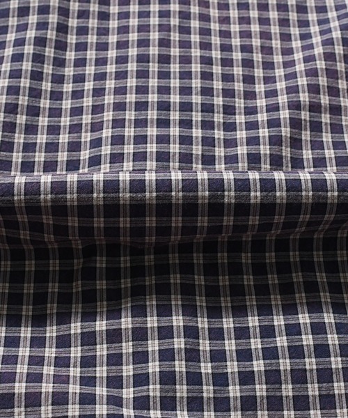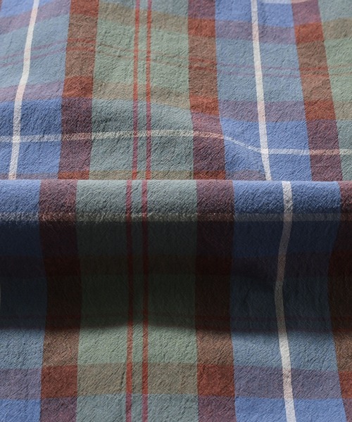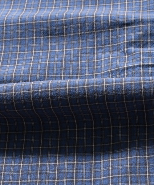 通常、チェック柄に織り上げた生地にブリーチ加工をすると赤く変色してしまうのですが、特殊な加工を施す事で長く着込んだような退色感が生まれ、ヴィンテージシャツのような風合いを再現しています。