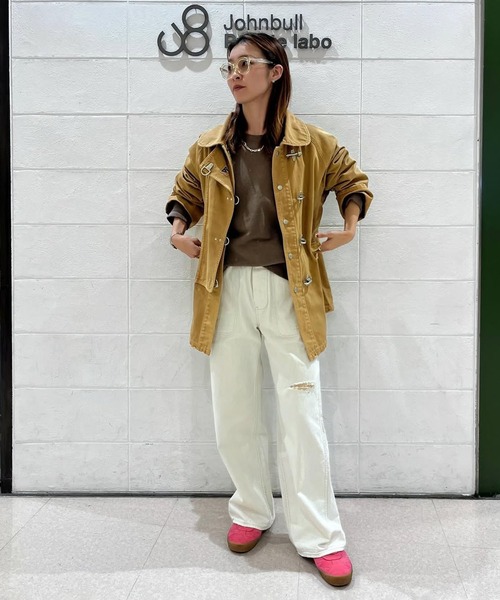 ホワイトカツラギを製品染めし、さらにダメージやエイジング加工を施して洗いこむことで、ワークウェアのようなヴィンテージな雰囲気に仕上げております。