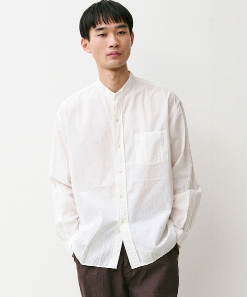 コットンローン素材を使用したバンドカラーカラーシャツ。