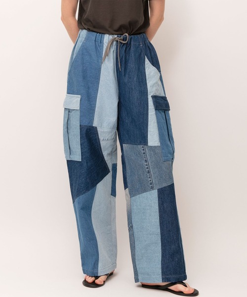 製品や古着、未使用の生地などデニムを使用した6ポケットのカーゴパンツ。