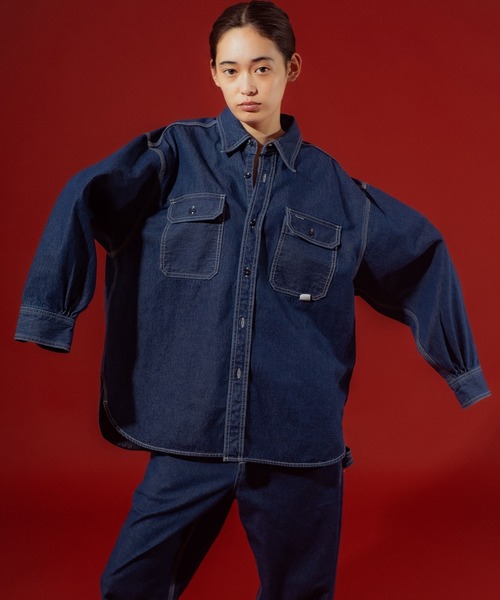 フラップ付きのダブルポケットや、裾のカーブなどワークシャツならではのディティールを活かしたデザインで、女性が着た時に華奢に見えるよう肩の位置やポケットの位置を調整しています。