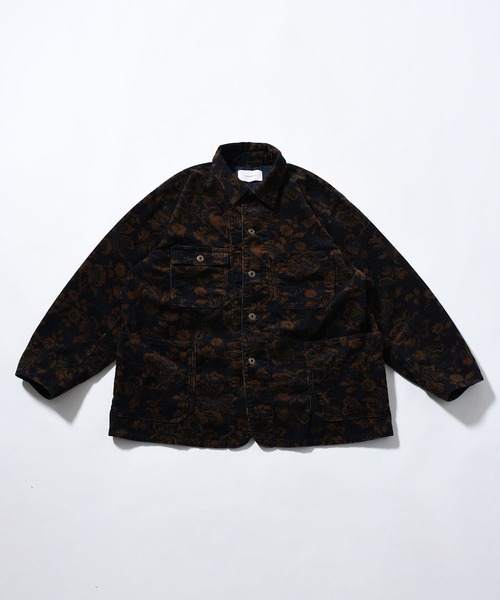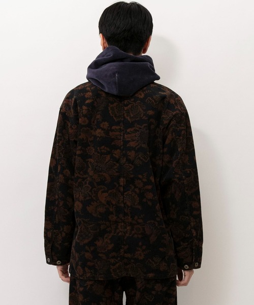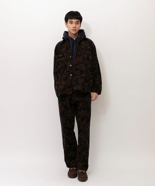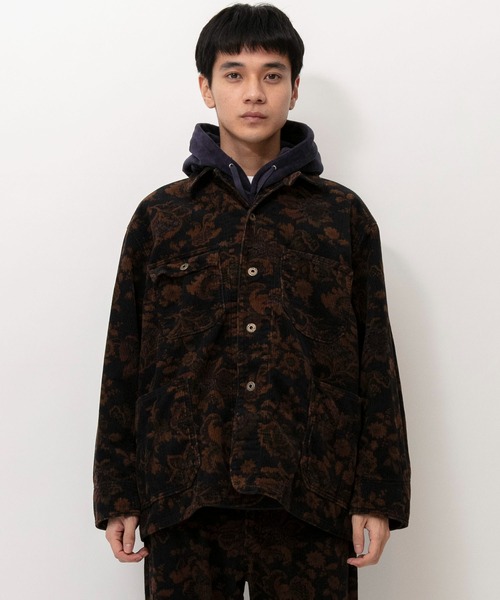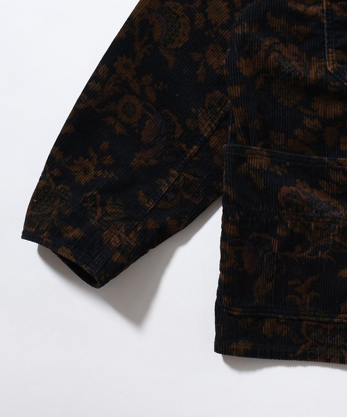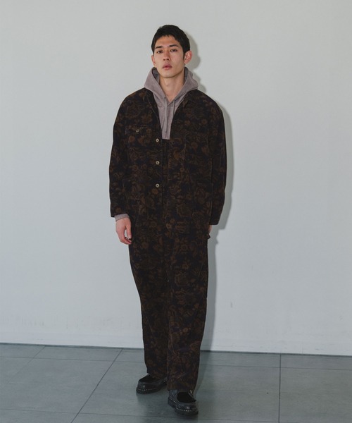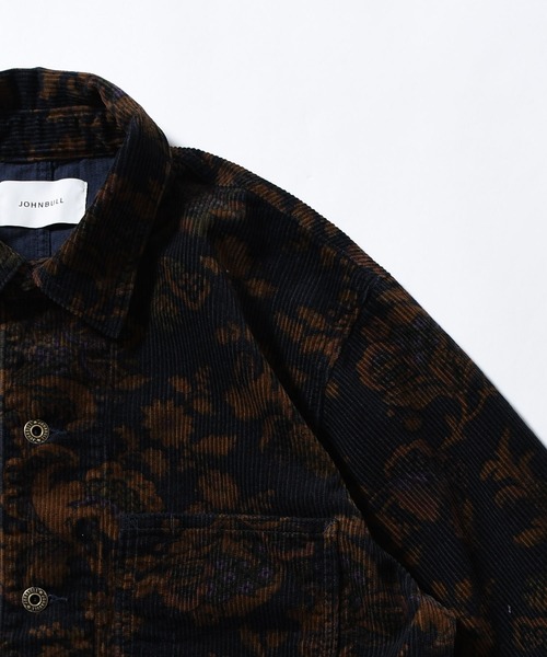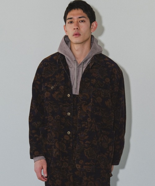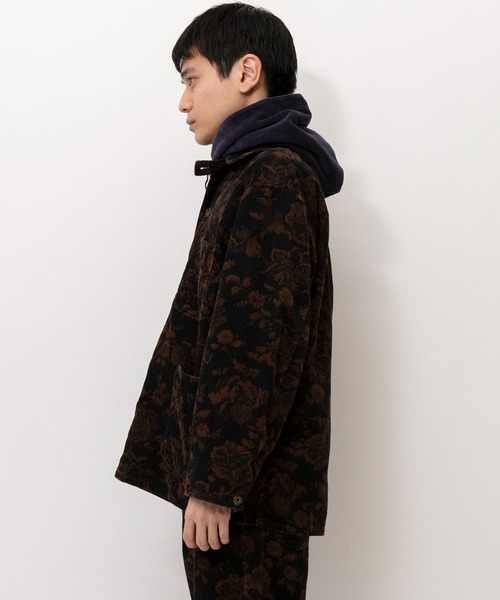 カジュアルな印象のコーデュロイ素材に同色系のボタニカル柄プリントを入れることで、印象的で深みのある雰囲気に仕上げています。