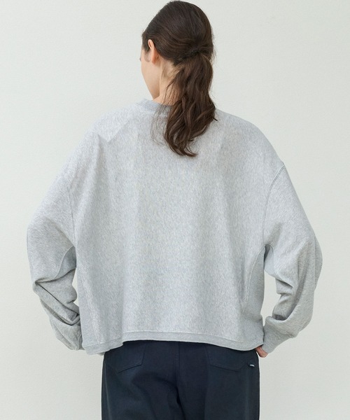 シルエットは、身幅にゆとりがありコンパクトな着丈のボックスシルエット。ハリのある生地なので、身体のラインを拾わず着用していただけます。