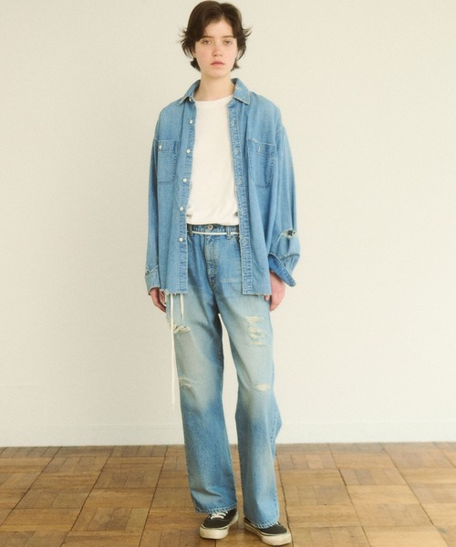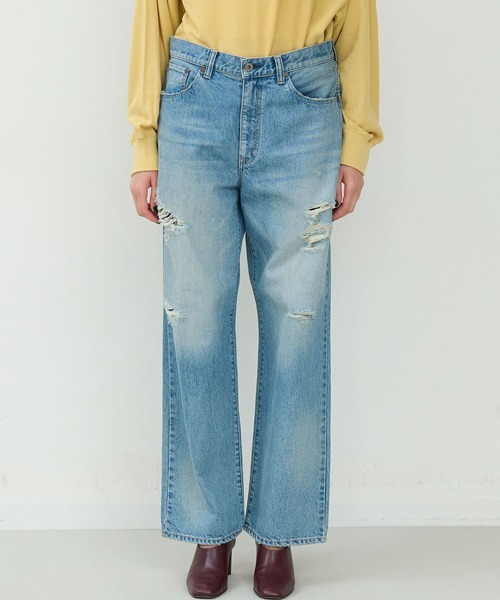 "ハードなダメージ加工と爽やかなブルーの色合いがお気に入りです。シルエットはワイドストレートで脚長効果もあり、ヒップや腿周りのラインもカバーしてくれます。ダメージ加工ですが、大人な女性にも穿きやすいダメージなので、年齢問わずかっこよく穿いていただけるジーンズです。トップスは明るいカラーや女性らしいトップスで、メリハリのあるスタイリングに仕上がります。"