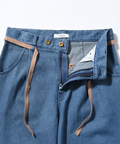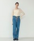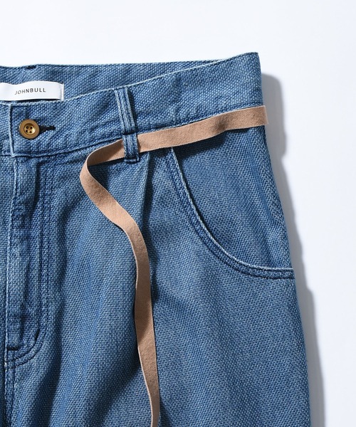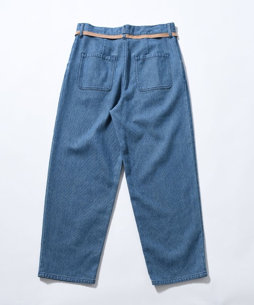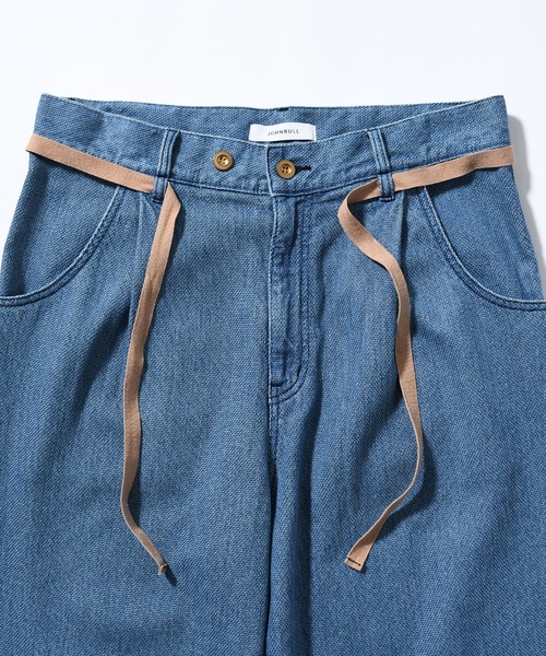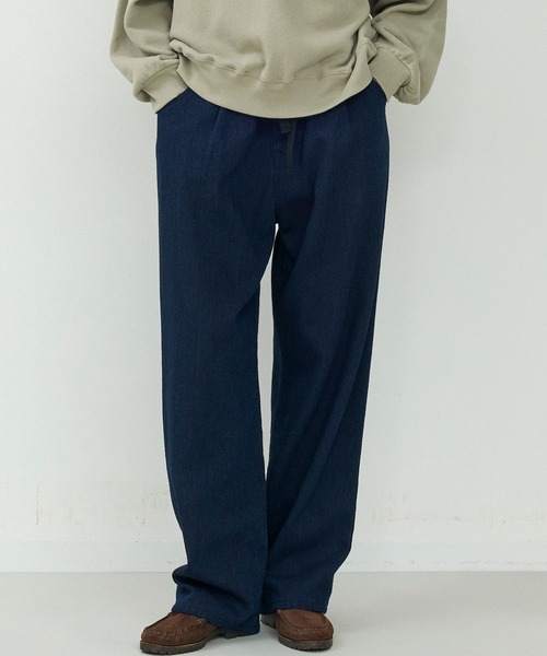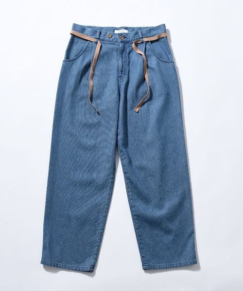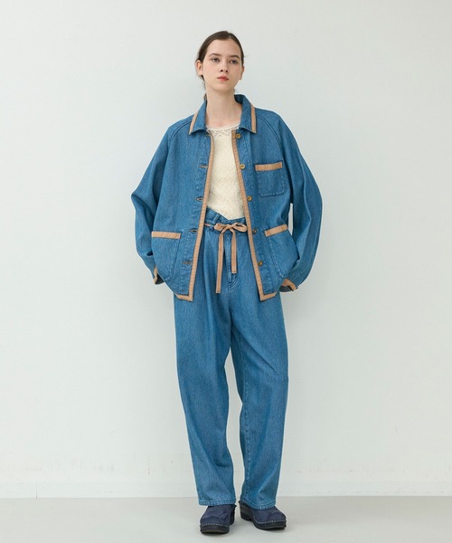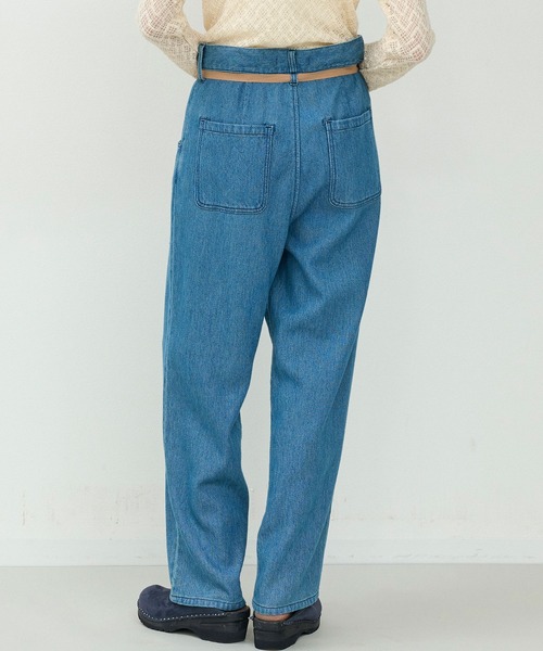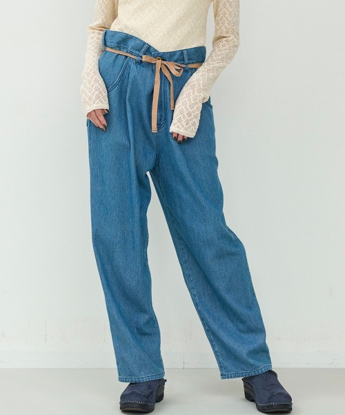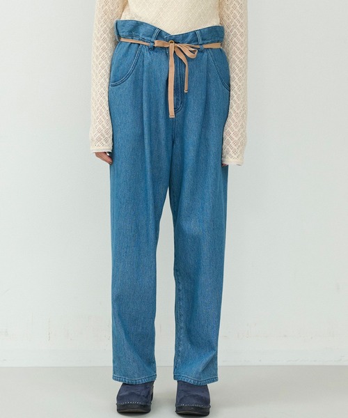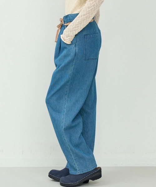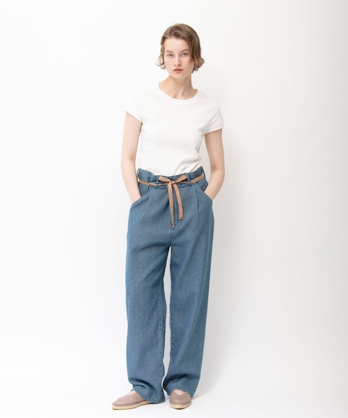 "デニムですがとても穿きやすい柔らかい生地で、お出掛けにもおうちでのリラックスタイムにも合うジーンズです。同じ生地のジャケットとのセットアップもおすすめです。すっきりしたトップスと合わせてタックインし、ベルトや付属の紐をポイントにするとスタイルアップになります。"