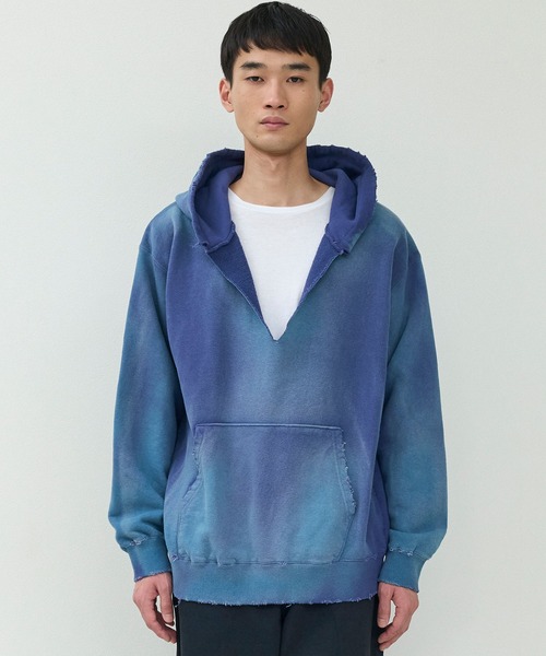 ムラ染めが特徴のスウェットパーカー。
