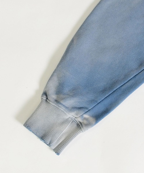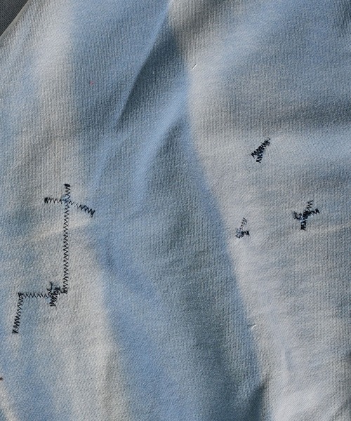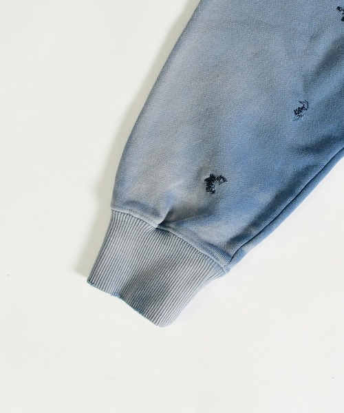 程よい厚みの10オンスの裏毛を使用しており、ダメージ加工、さらに随所にリメイク加工を施しヴィンテージライクな雰囲気に仕上げています。