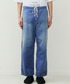 腰回りはゆったり、全体的にストレートワイドシルエットで、ウエストの紐を絞って調整して履いていただきます。